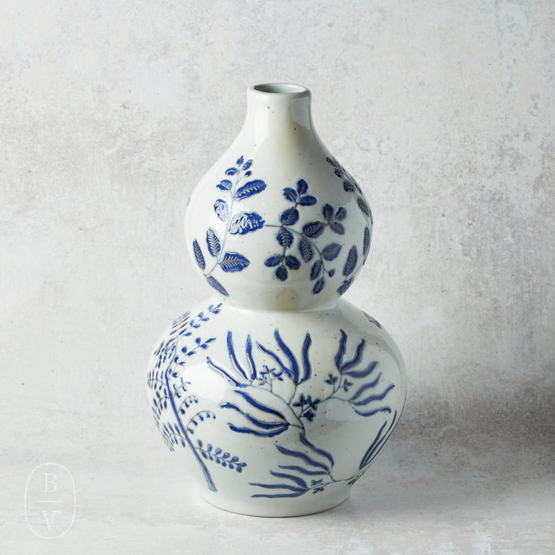This stoneware vase combines a classic palette with a modern silhouette. Its double-gourd shape is accented with hand-detailed botanical patterns in deep cobalt blue, set against a soft white glaze. Perfect as a standalone accent or styled with fresh or dried stems, it adds an elegant touch to coffee tables, shelves, and entryways.