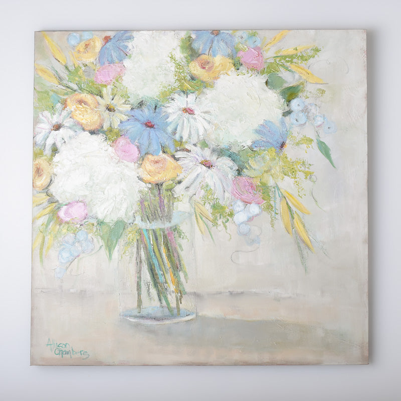 Allison Chambers is a contemporary oil painter known for her evocative floral still life compositions. Her work explores the intersection of classical painting traditions and modern sensibility, capturing botanical subjects with meticulous attention to light, texture, and color harmony. Chambers' pieces are celebrated for their emotional depth and technical precision, drawing viewers into intimate moments of natural beauty. Her paintings are held in private collections across the United States and have been featured in galleries specializing in contemporary representational art.- Dimensions: 36W x 36H