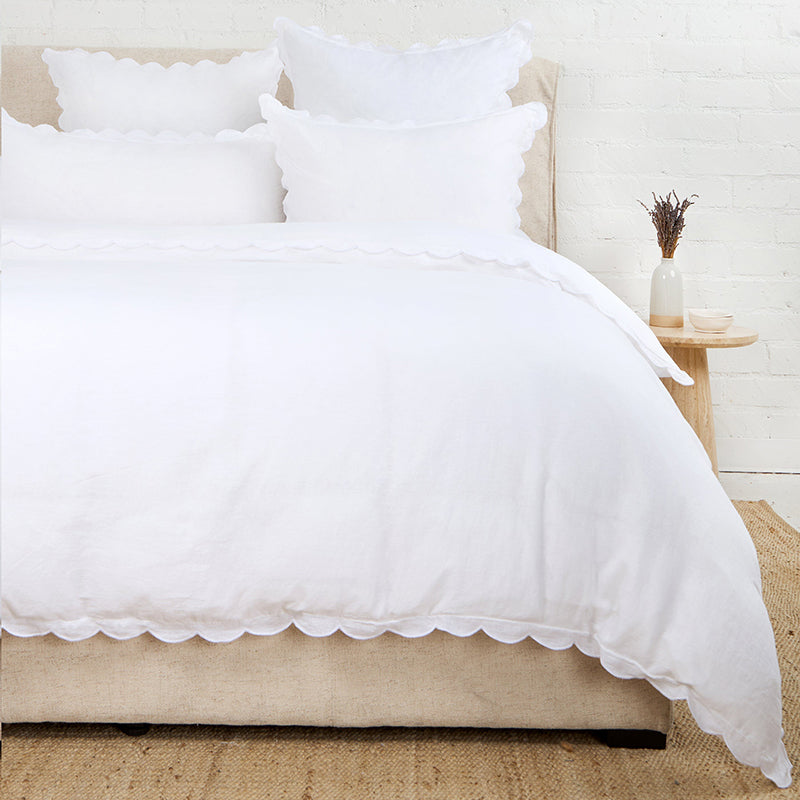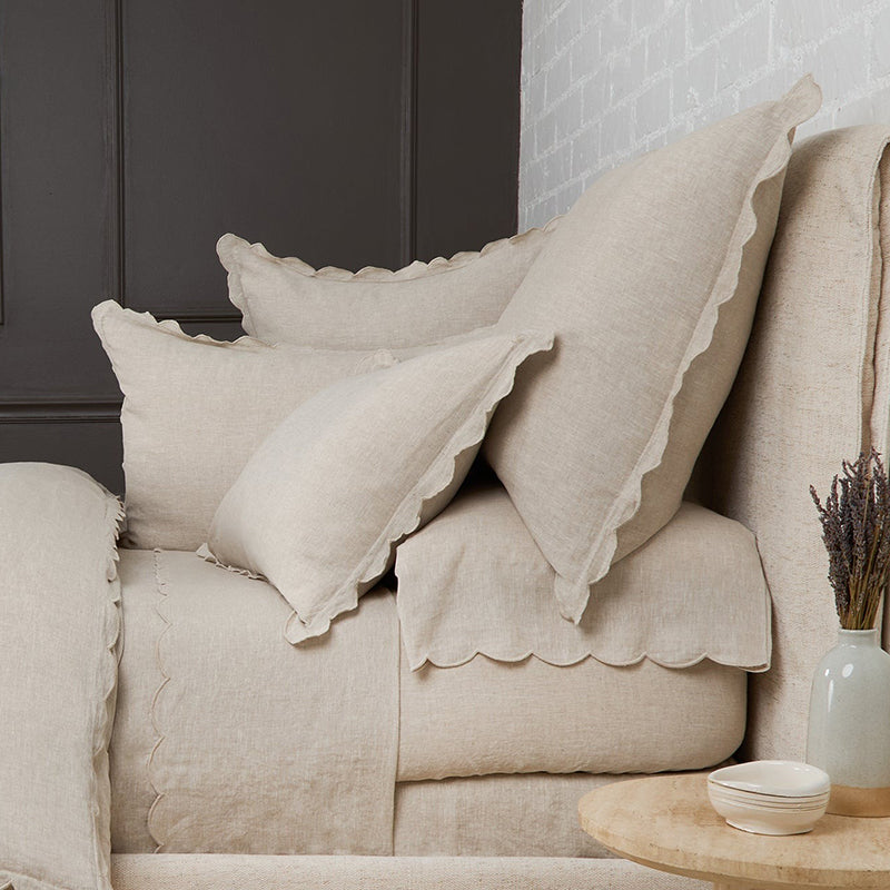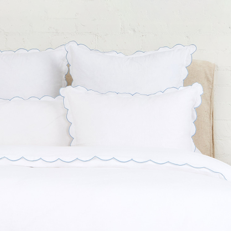 The Kelly Sham embellishes classic linens with delicately embroidered scalloping in a range of soft hues. Kelly’s thread embroidery gives each edge dimension along with a hint of color.