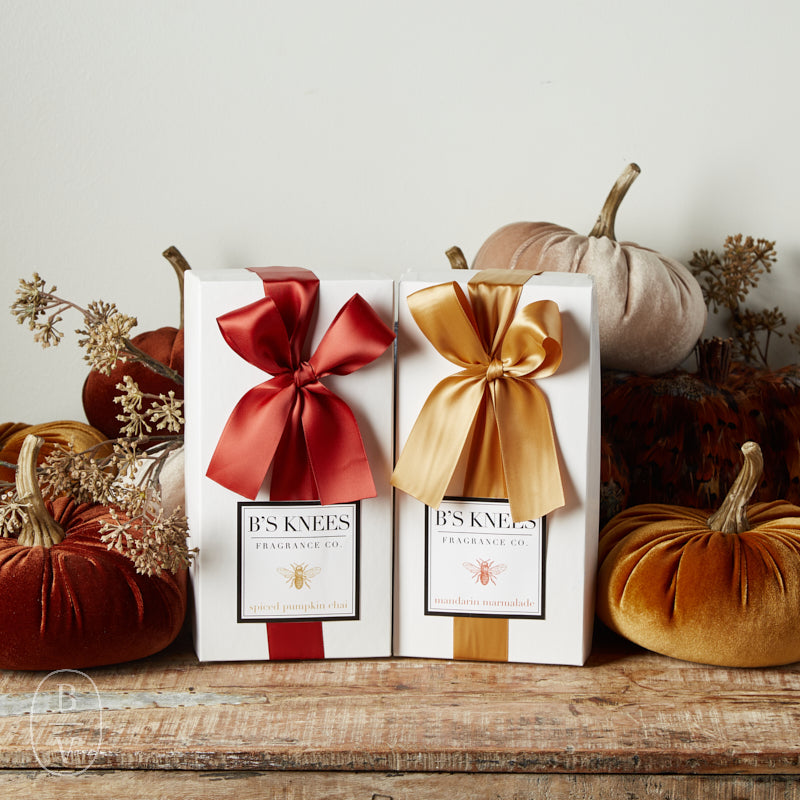 Illuminate your space with the pure indulgence of B's Knees Fragrance Co. This Seasonal Reed Diffuser is adorned with paper flowers and luscious fall scents to infuse your home with essential oil fragrance. Packaged in a charming box with a bow, it makes for a perfect gift. Transform any occasion into a sanctuary of peace and serenity. Discover B's Knees today!