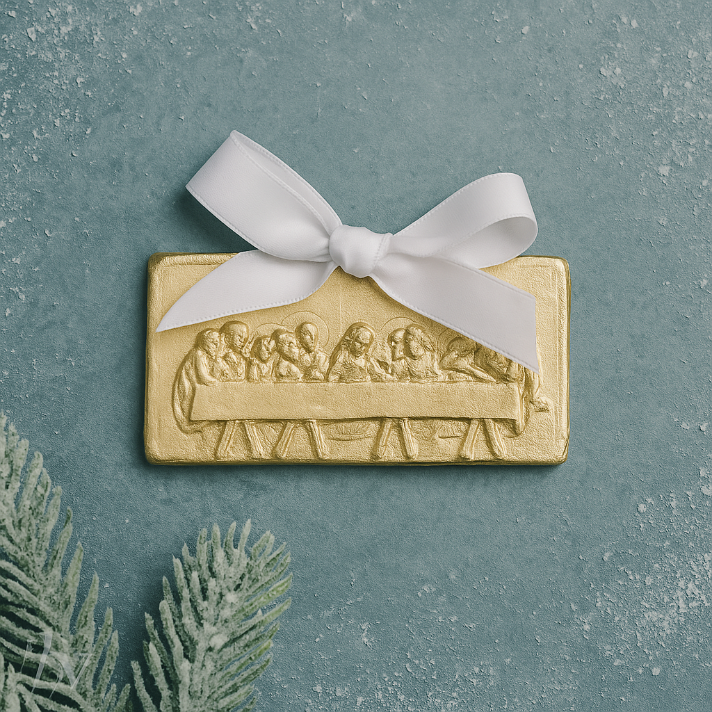 Add a meaningful touch to your holiday décor with this Last Supper in Gold Ornament. Featuring a beautifully detailed gold-tone depiction of the iconic scene, this ornament brings a hint of elegance and tradition to your Christmas tree, wreath, or garland. It arrives pre-wrapped and ready to gift, making it a thoughtful Christmas present for anyone who appreciates faith-inspired pieces. A timeless ornament that adds warmth and significance to your seasonal celebrations.