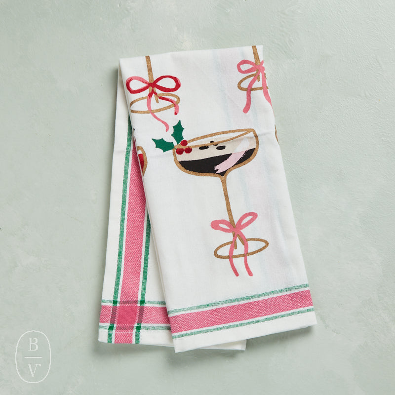 Bring festive fun to your kitchen with this cheerful holiday tea towel! Featuring a playful print of champagne coupes wrapped in bows and holly accents. Crafted from soft, absorbent cotton with a pink and green border, this towel adds a pop of personality to your seasonal décor—ideal for drying dishes, wrapping a bottle of wine, or gifting to your favorite host.