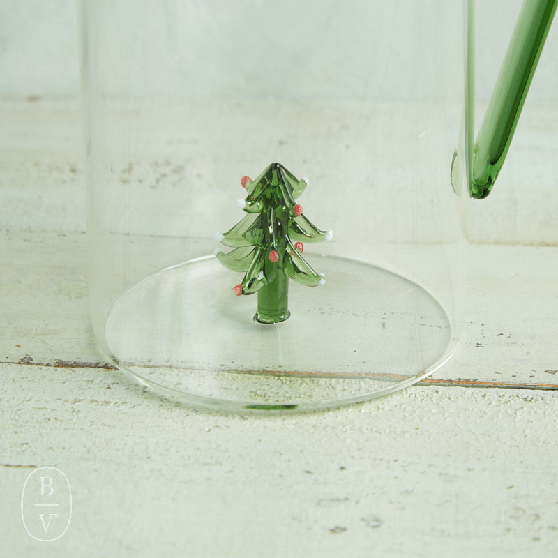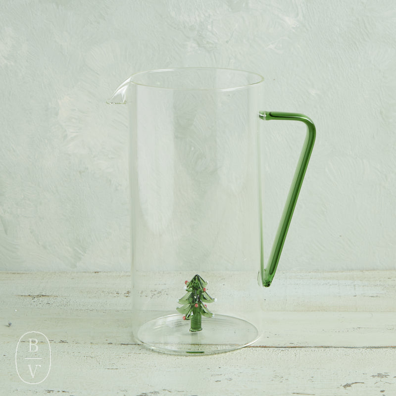 Serve in style with this festive glass pitcher featuring a charming Christmas tree accent at the base. The clear body and sleek green handle give it a modern yet whimsical touch, making it perfect for holiday gatherings or as a decorative display piece. Fill it with your favorite drinks and let the subtle holiday detail shine.