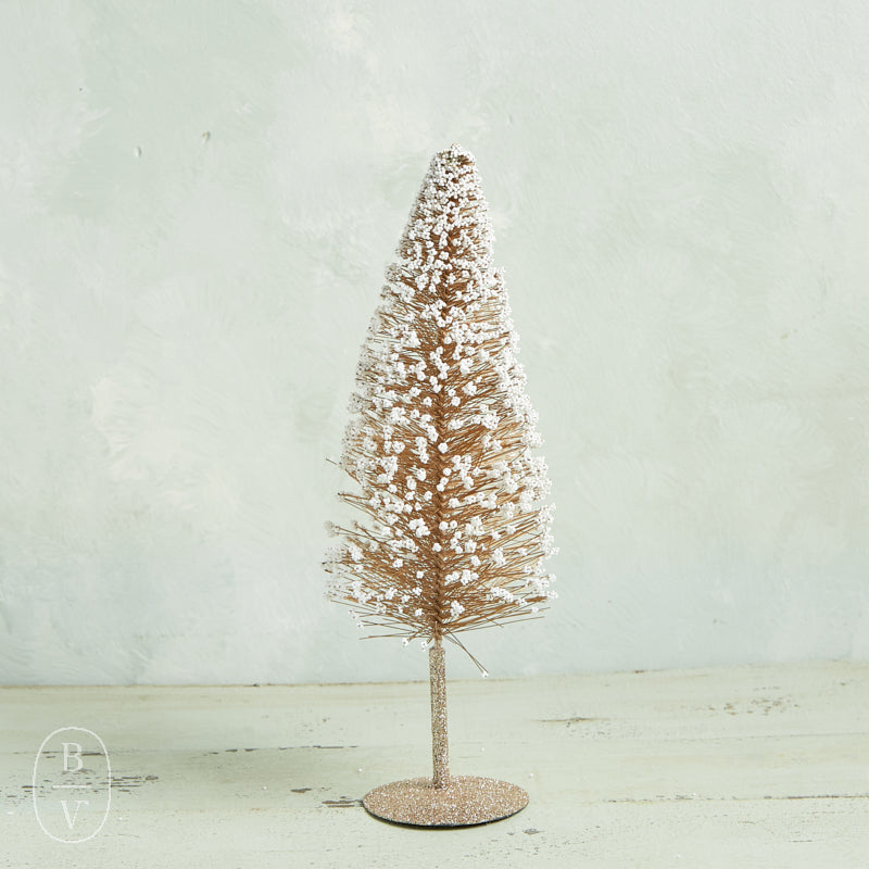 Add sparkle and texture to your holiday décor with these Glitter Bottle Brush Trees. Featuring a warm golden hue accented with snowy microbeads and glitter, each tree brings festive charm and dimension to mantels, tabletops, or holiday displays. Available in two sizes, they look stunning displayed individually or grouped together for a layered winter wonderland effect.