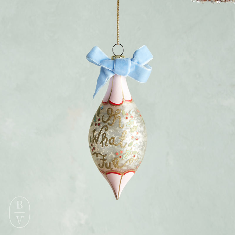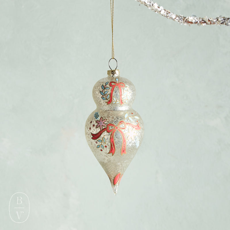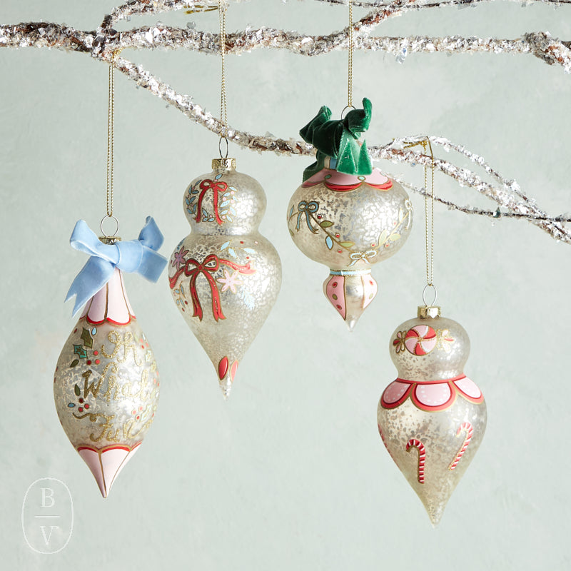 Add a nostalgic charm to your holiday décor with these hand-painted glass ornaments. Each ornament features an antique mercury-glass finish, detailed with pastel trims, metallic accents, and whimsical holiday motifs. Topped with delicate velvet ribbons and intricate painted designs, these heirloom-inspired ornaments bring a touch of vintage magic to any Christmas tree. Choose your favorite shape—or mix and match for a collected, storybook look.