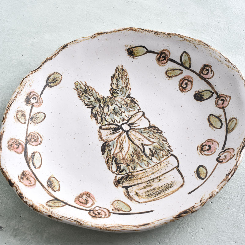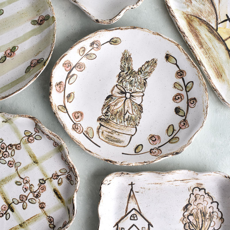 The Bunny Topiary Plate from Etta B Pottery features a whimsical bunny-shaped topiary in a flower pot, complete with delicate vines and pink blooms. Handmade and hand-painted, this salad-plate sized piece is lovely layered into a spring place setting or displayed on a stand for Easter décor. Each one has its own character thanks to the handcrafted finish. View more items from Etta B Pottery’s Easter Collection.