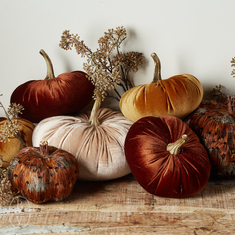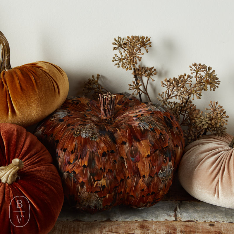 The Twig Stem Feather Pumpkin offers a rustic, artisanal look with its dark tones and unique texture, a striking accent for autumn displays and seasonal décor.