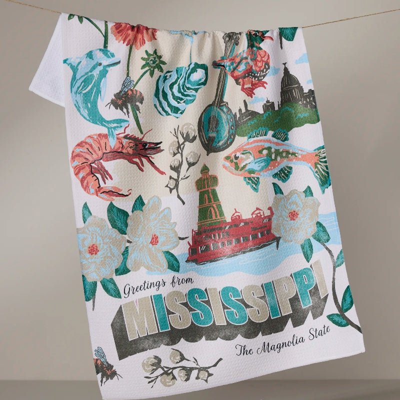 Bring Southern charm to your kitchen with this GREETINGS FROM MISSISSIPPI TEA TOWEL. Ultra-absorbent and quick-drying, it masterfully combines style with everyday practicality. Whether you're wiping down counters or adding a decorative touch to your culinary space, this versatile towel delivers. Its thoughtful design makes it an ideal gift for the holidays or any occasion—perfect for anyone who appreciates quality home essentials with personality.