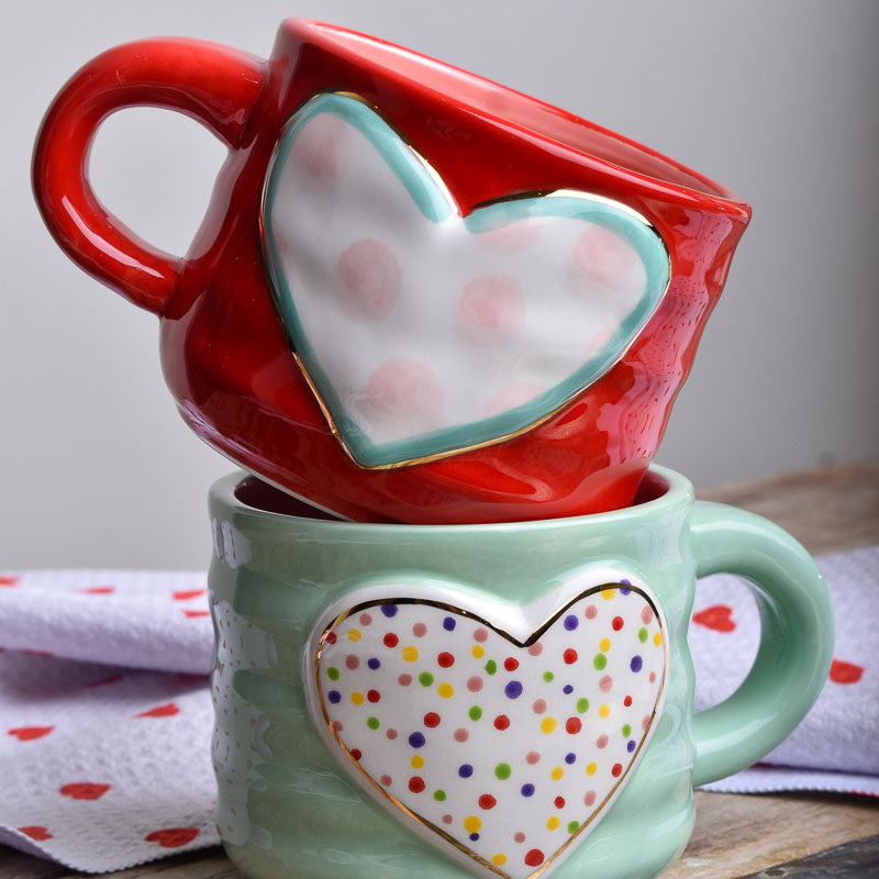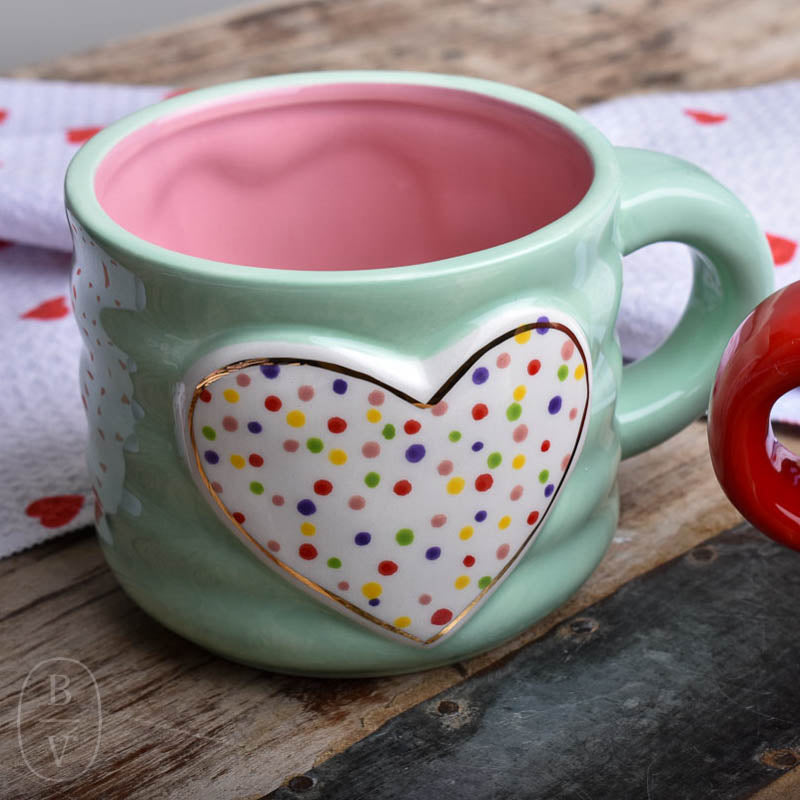 Fall in love with our Polka Dot Heart Mug! With a light blue body and adorable heart and multi-color polka dots, this charming mug will warm your heart with each sip, making your morning routine a little sweeter. Sip in style and spread the love with this must-have addition to your kitchen collection!