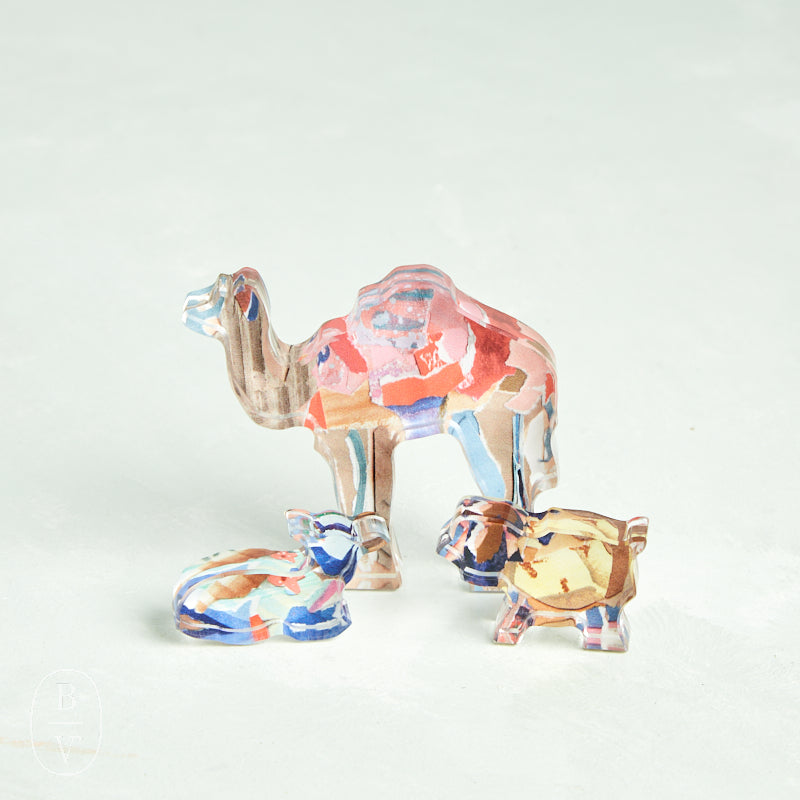 - Features: Set includes 1 Camel and 2 Sheep. Original artwork by Lauren Dunn reproduced on acrylic. Stands on its own. Proudly made in the USA.