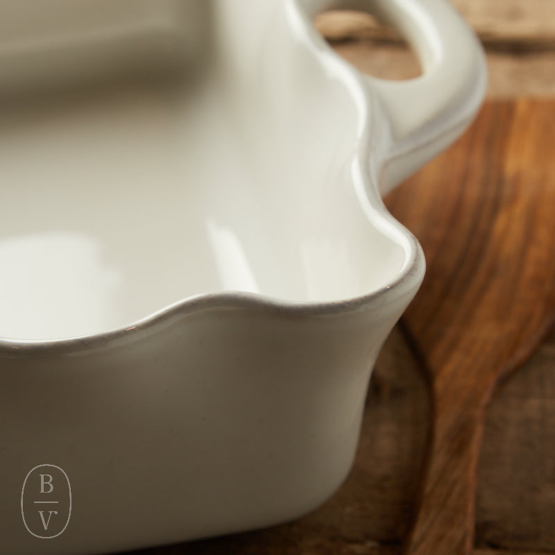 The Ruffled Large Rectangle Baker combines everyday function with elegant detail. Crafted in Portugal from durable stoneware, it features softly ruffled edges that add a delicate, decorative touch to its practical form. Perfect for baked dishes, casseroles, or desserts, it transitions seamlessly from oven to table with effortless charm.