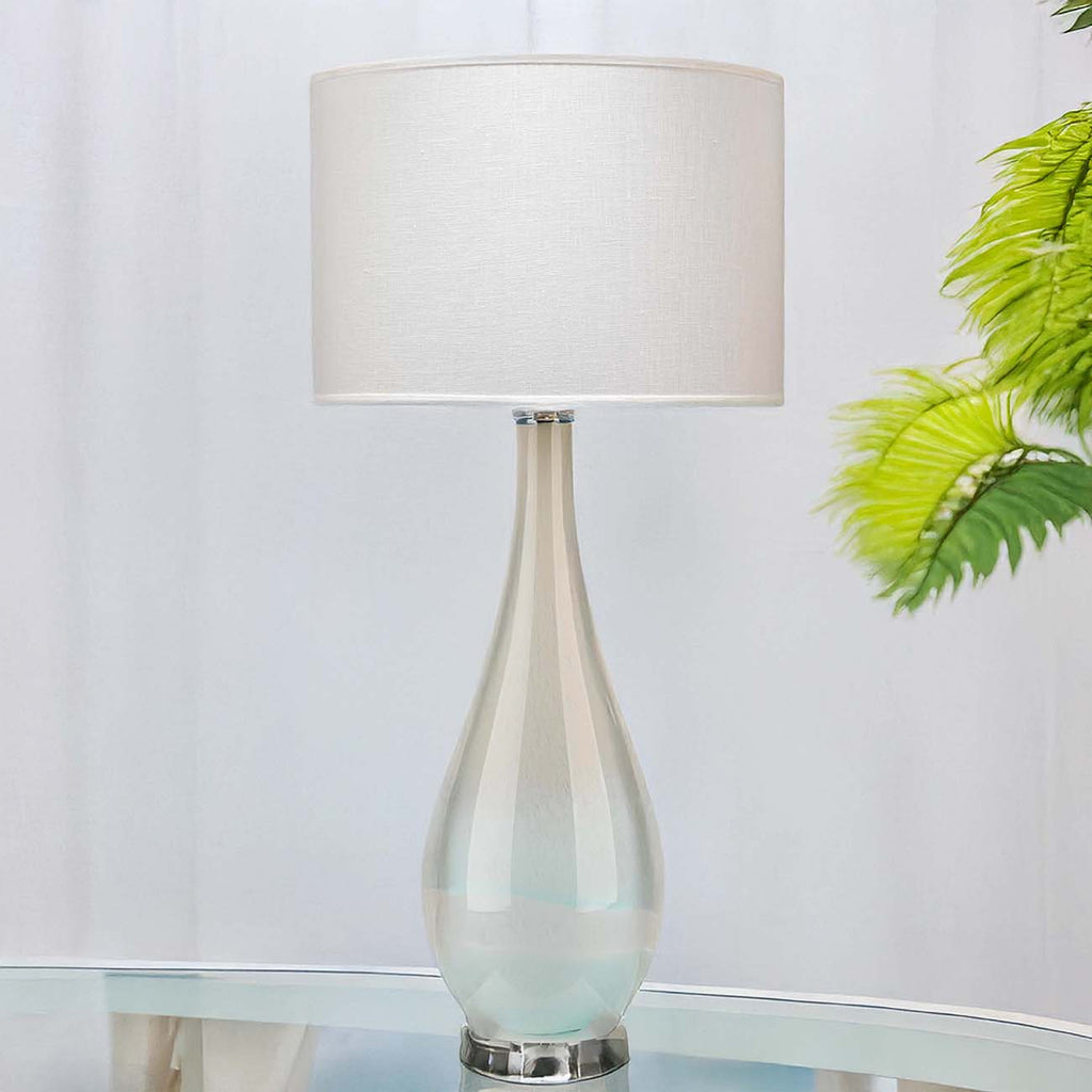 • Materials: Made of hand-blown glass, 100% White Linen Classic Drum Shade, acrylic base