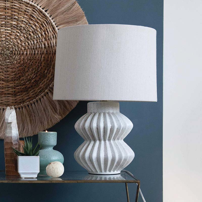 This table lamp features a fluted terracotta base with a distressed white finish that adds vintage charm and rich texture to any space. A crisp white linen shade softens the light for a warm, inviting glow. With a rotary switch and standard bulb compatibility, it brings both character and cozy illumination to living rooms, bedrooms, or offices.