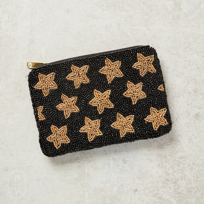 Add a touch of sparkle to your Gameday look with the Stars Beaded Zip Pouch. Hand-beaded with glimmering gold stars on a sleek black backdrop, this compact pouch is perfect for holding cards, cash, or keys. Small enough to slip into a stadium-approved bag, yet bold enough to stand out on its own, it features a secure top zip closure to keep your essentials stylishly in place.