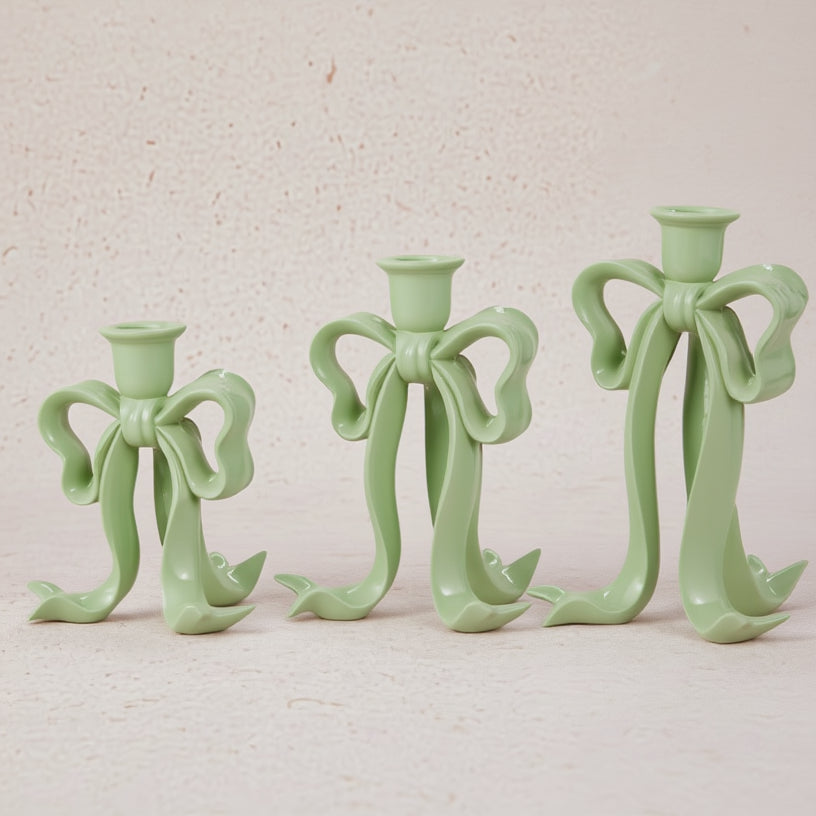 These charming light green bow-shaped candlesticks bring whimsical elegance and a touch of playful sophistication to your tablescape or mantel. Create a memorable ambiance with their graceful silhouette while adding a pop of color that complements everyday décor.