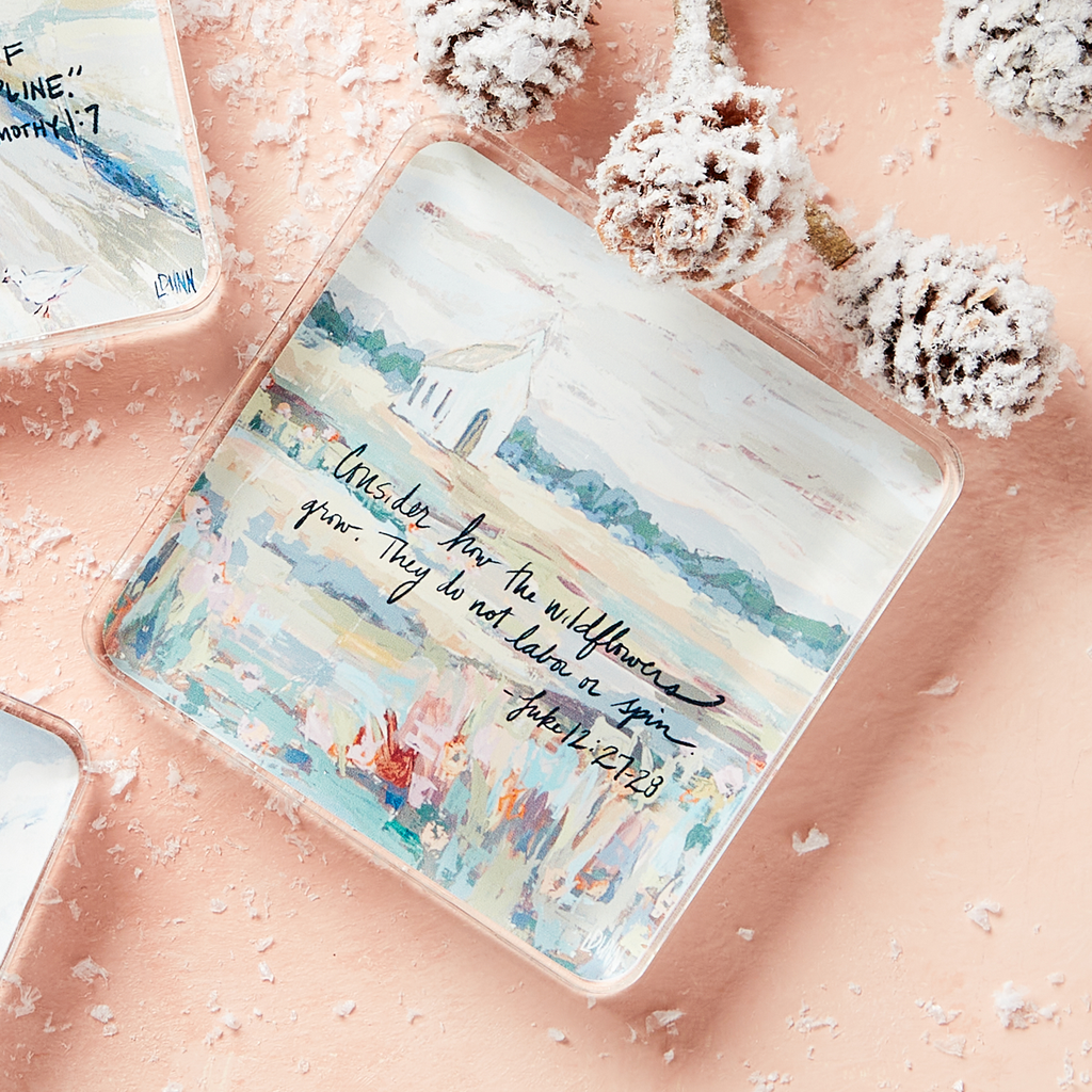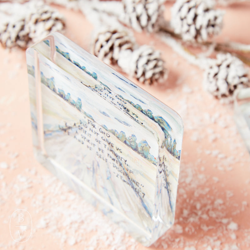 Infused with the beauty of Lauren Dunn’s original artwork, the Acrylic Scripture Block brings timeless words of faith into focus. Each piece has a cherished Bible verse elegantly printed within, creating a luminous effect that catches the light and draws the eye. Both decorative and meaningful, this piece offers a graceful way to display inspiration in any room—whether set on a desk, bookshelf, or side table.