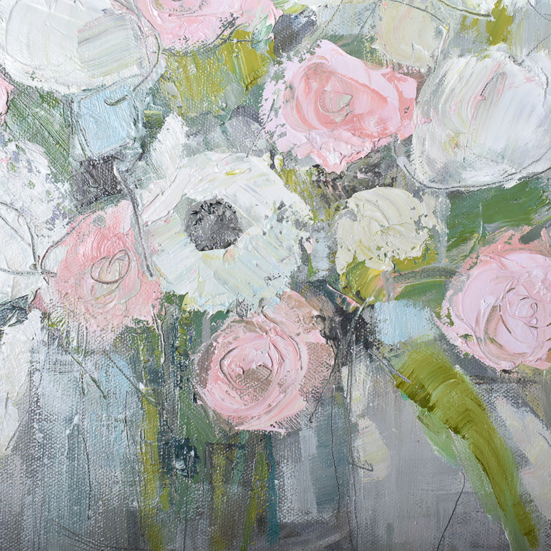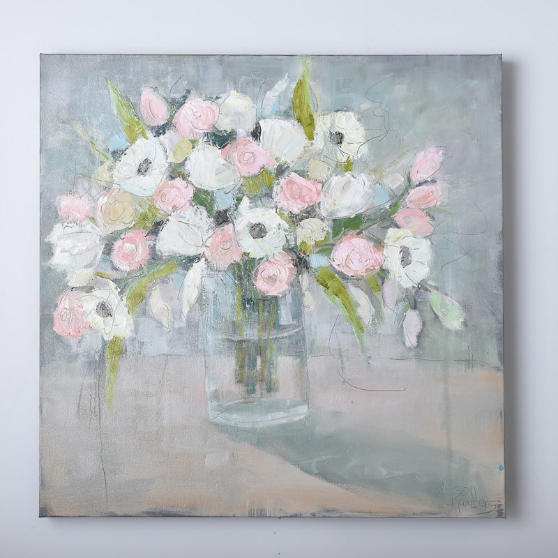 A stunning floral still life capturing the delicate beauty of anemones and ranunculus in full bloom. This oil on canvas painting by artist Allison Chambers showcases rich, layered brushwork and vibrant color harmonies that bring these garden flowers to life. The composition draws the viewer into an intimate moment of natural elegance, perfect for adding sophistication and artistic character to any room. 30x40 inches | Oil on canvas | By Allison Chambers