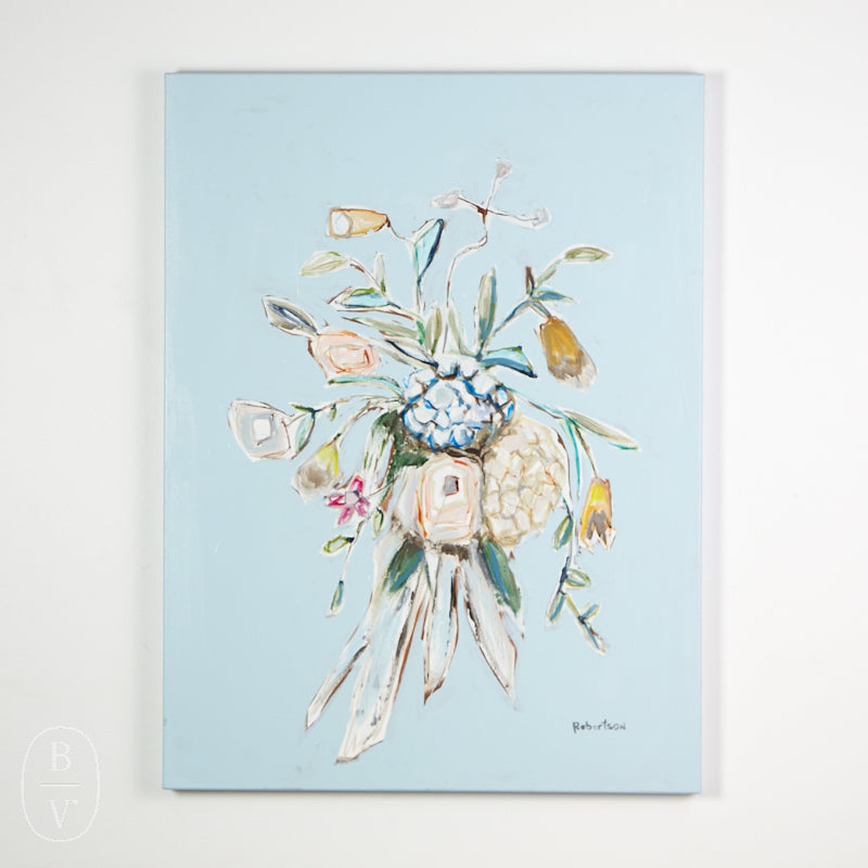 Introducing BOUQUET ON BLUE by Sarah Robertson - the perfect addition to your home décor. This beautiful vase painting depicts a lovely spring floral arrangement, bringing a touch of nature and new beginnings into any space. Brighten up your home and embrace the beauty of spring with this stunning piece.