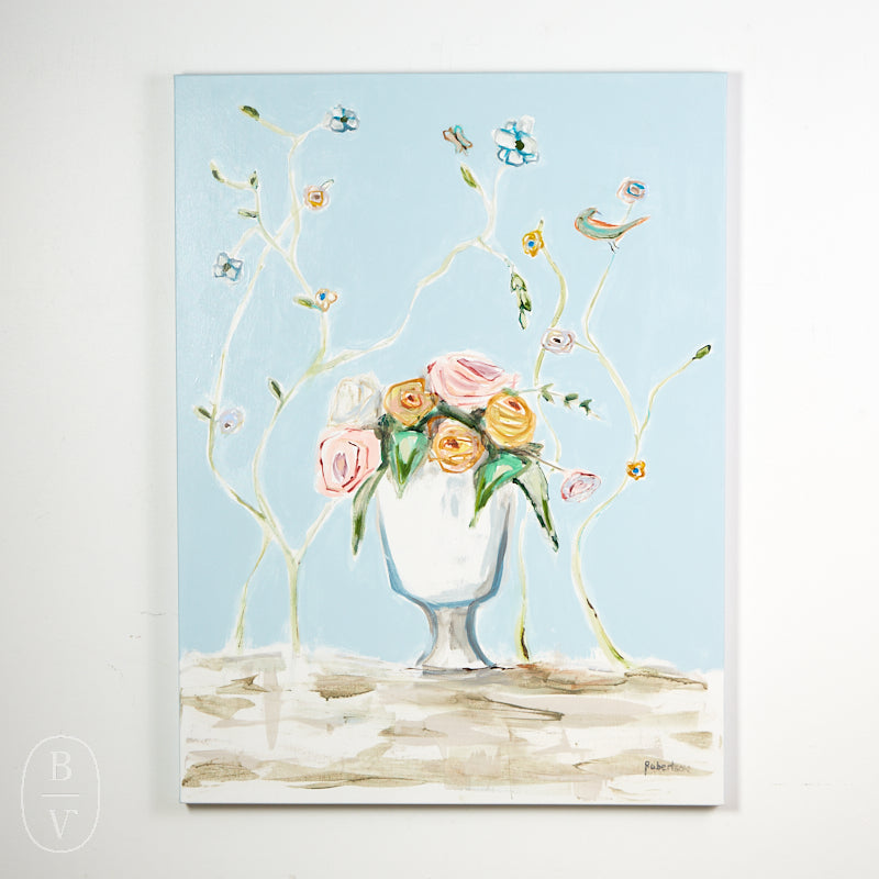 Introducing GARDEN VASE ON BLUE by Sarah Robertson - the perfect addition to your home décor. This beautiful vase painting depicts a lovely spring floral arrangement, bringing a touch of nature and new beginnings into any space. Brighten up your home and embrace the beauty of spring with this stunning piece.
