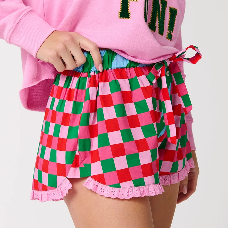 Festive checkered boxers that blend retro charm with modern comfort. The playful pattern, delicate lace trim, and contrasting edges create an eye-catching look perfect for holiday lounging or showing off in photos. Cozy enough for all-day wear, stylish enough to celebrate in.