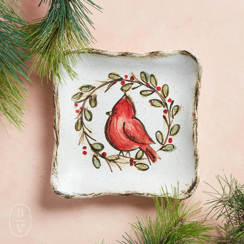 The Cardinal Keepsake Dish from Etta B Pottery is a meaningful piece that carries both beauty and sentiment. Hand-painted with a bright red cardinal framed by a delicate wreath of greenery and berries, it’s a design often cherished as a symbol of comfort and remembrance during the holidays. The square shape makes it a versatile accent for serving small treats, holding trinkets, or displaying as part of your seasonal décor.