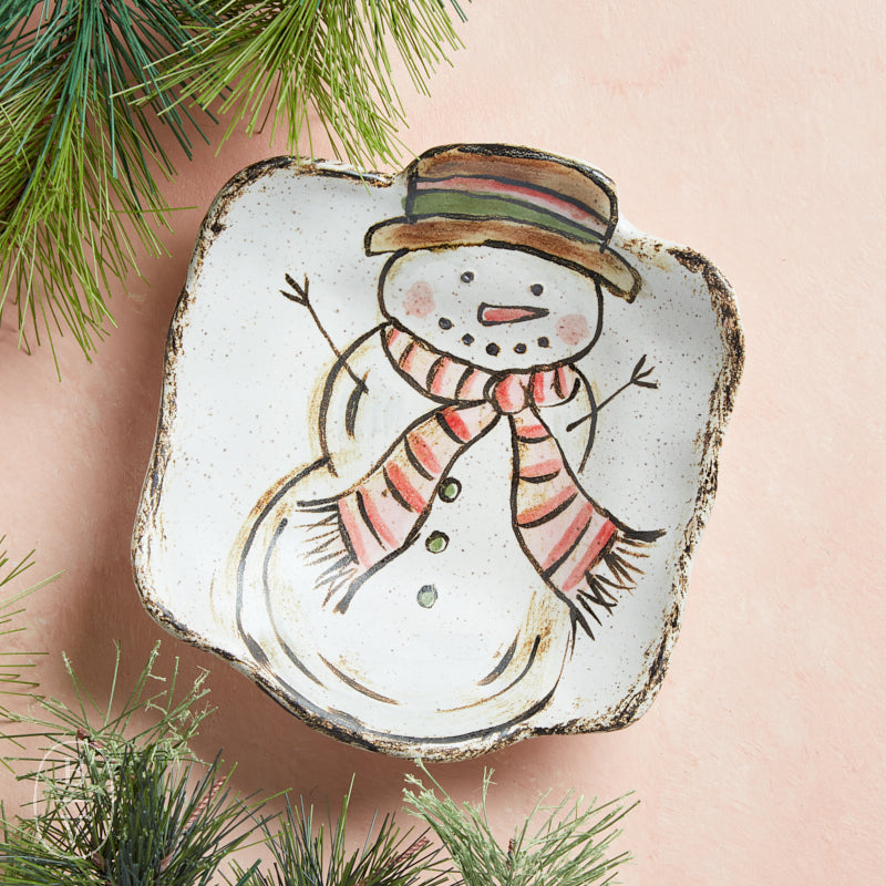The Frosty Cheer Dish from Etta B Pottery brings a lighthearted touch to holiday entertaining. Featuring a hand-painted snowman in a striped scarf and hat, this square dish has a playful design with rustic charm. Perfect for serving candies, cookies, or appetizers, it’s a piece that easily doubles as cheerful décor all winter long.