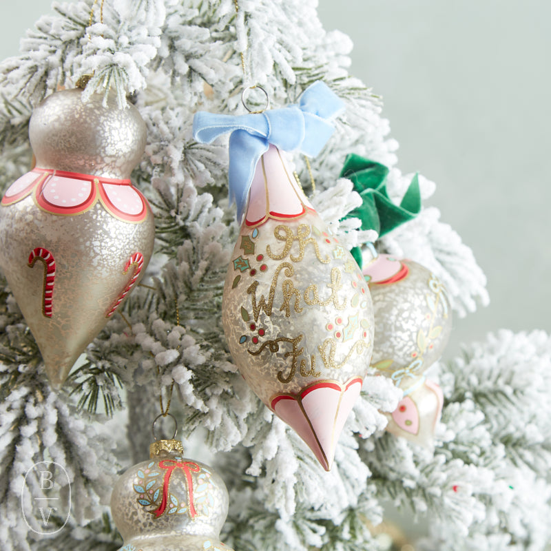Add a nostalgic charm to your holiday décor with these hand-painted glass ornaments. Each ornament features an antique mercury-glass finish, detailed with pastel trims, metallic accents, and whimsical holiday motifs. Topped with delicate velvet ribbons and intricate painted designs, these heirloom-inspired ornaments bring a touch of vintage magic to any Christmas tree. Choose your favorite shape—or mix and match for a collected, storybook look.