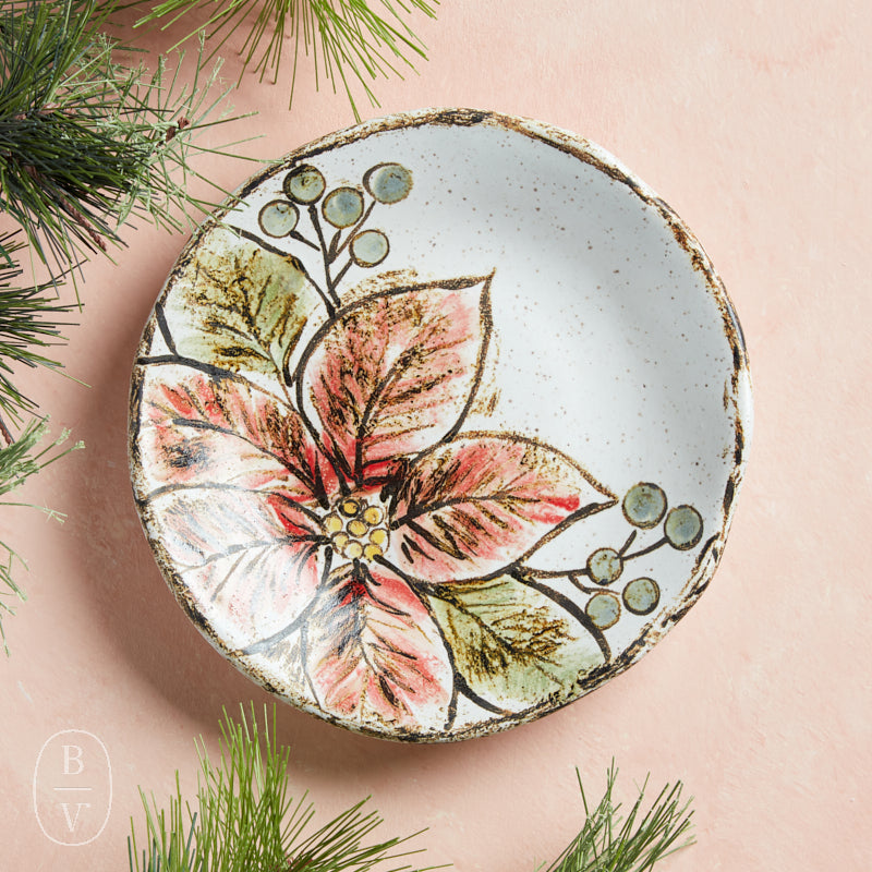 The Heirloom Poinsettia Plate from Etta B Pottery highlights a holiday favorite in timeless hand-painted style. Featuring a large poinsettia bloom accented with greenery and berries, this piece brings warmth and elegance to seasonal gatherings. Perfect for serving desserts, appetizers, or as a decorative accent, it’s a plate that captures the tradition and beauty of Christmas.