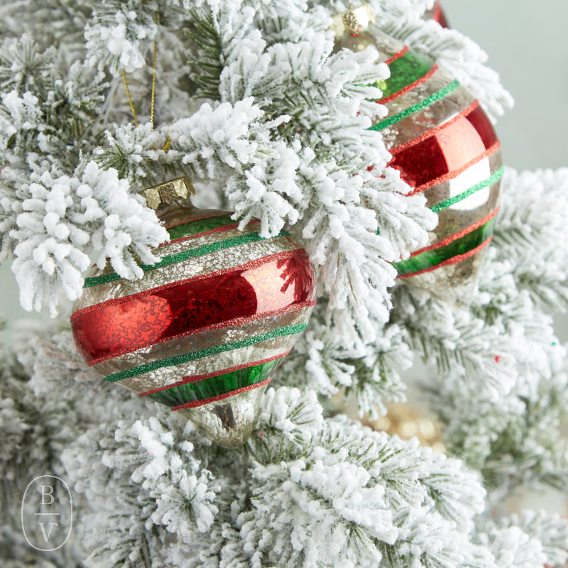 Add classic holiday charm to your tree with these shimmering glass ornaments, each featuring red, green, and silver stripes with a vintage-inspired mercury finish. Their rich color palette and timeless shapes make them an elegant addition to any festive décor, whether styled on your tree or layered into a bowl of ornaments for a sparkling centerpiece.