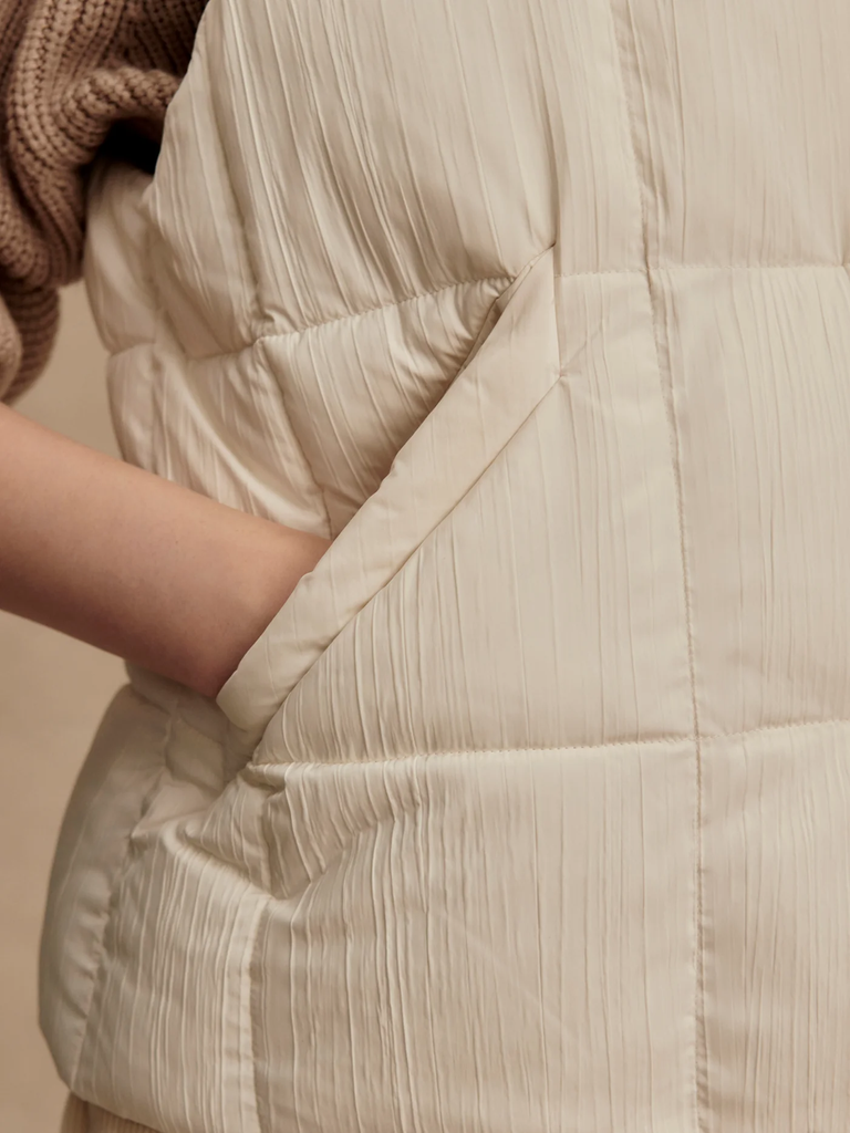 Effortlessly refined and endlessly versatile, this vest is the layering piece your wardrobe’s been waiting for. Designed with a sculptural collar and soft quilted texture, it brings a modern edge to cold-weather styling. The neutral ivory hue pairs beautifully with cozy knits and tailored separates alike, making it perfect for transitional dressing or everyday polish.
