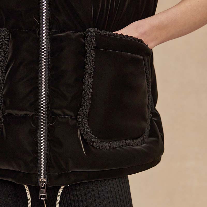 - Features: Oversized collar. Sherpa trimmed pockets. Double-ended zip. Adjustable hem.