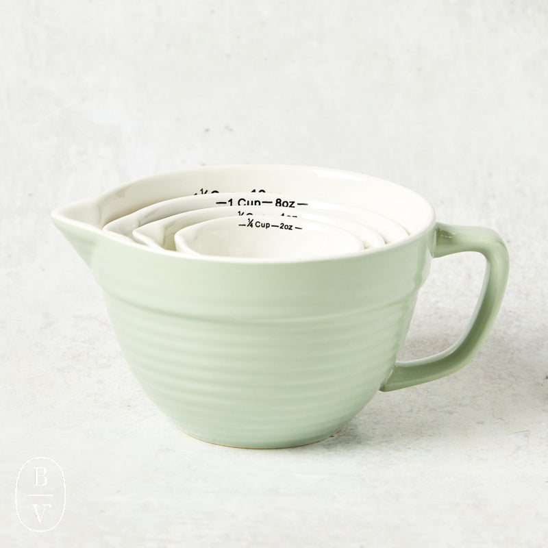 - Features: Set of 4: 1/4, 1/2, 1, 1 1/2 cup. Stackable for easy storage. V-shaped spout for easy pouring.